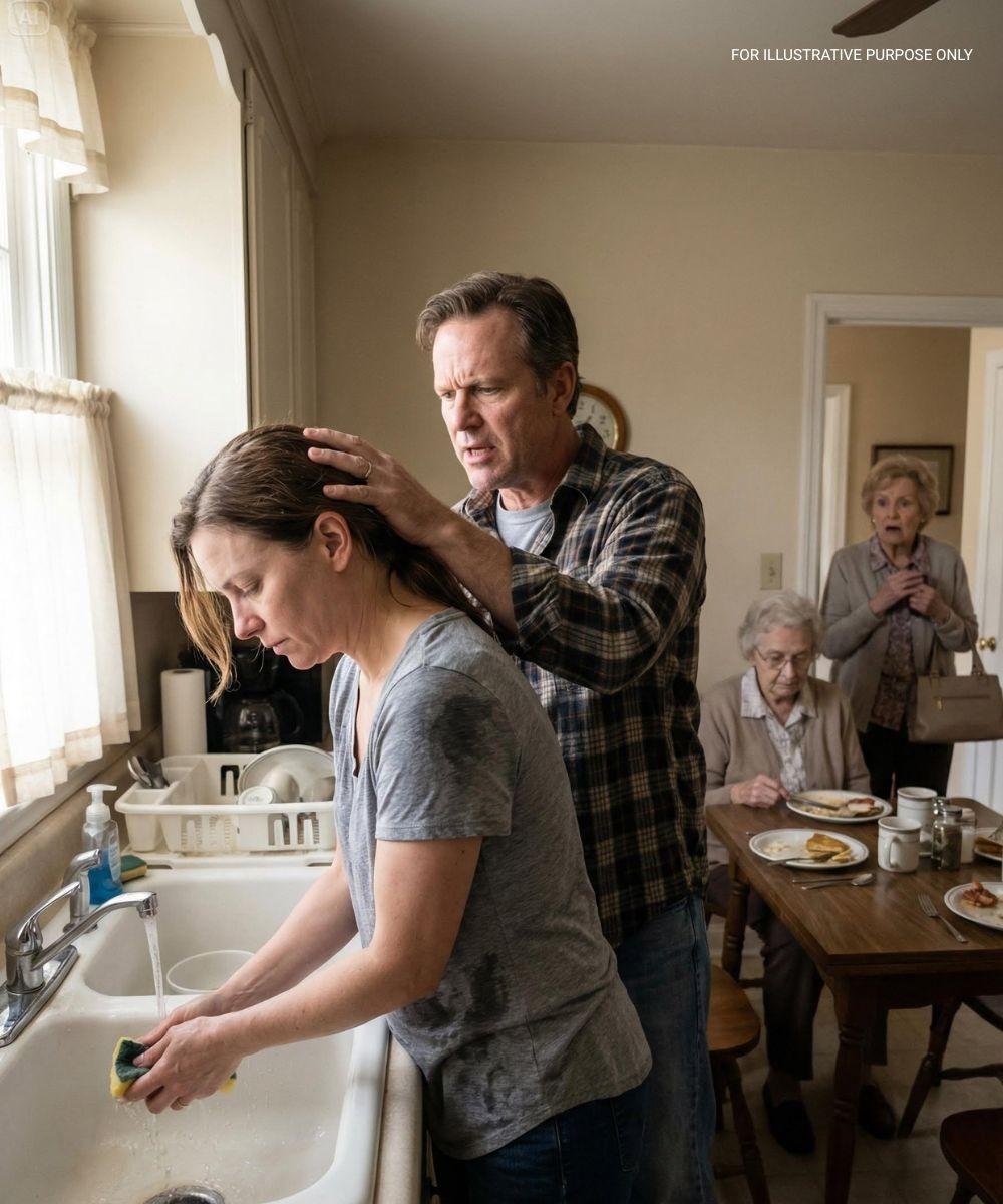 Laura stond bij de gootsteen en waste keer op keer de afwas. Ze droeg een dunne trui die duidelijk niet warm genoeg was. Haar handen trilden lichtjes, haar schouders waren stijf. Haar haar was nonchalant vastgebonden en haar gezicht zag er uitgeput uit – geen tranen, geen woede, alleen vermoeidheid.
