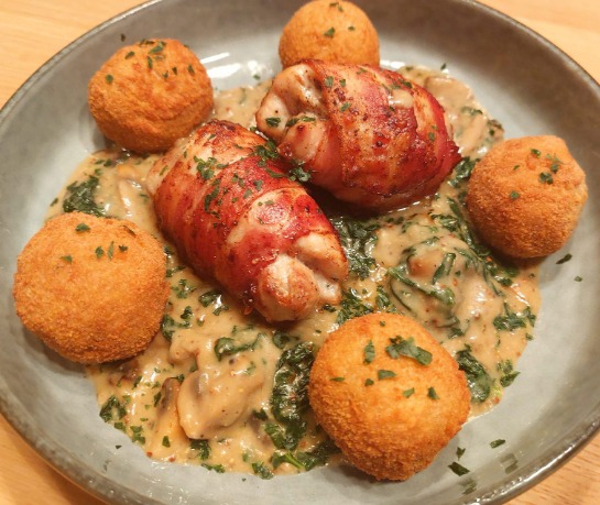 Dit gerecht is pure verwennerij – sappige kippendijen gewikkeld in spek, overgoten met een romige saus vol champignons & spinazie, geserveerd met krokante kroketten. Perfect voor een feestelijke maaltijd of een zondagse verwennerij!
