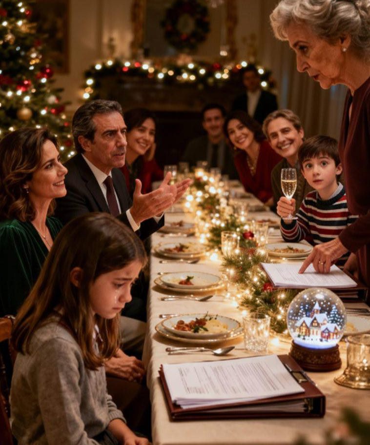 Midden in het kerstdiner hief mijn schoonmoeder haar glas en glimlachte: « Ik ben trots op al mijn kleinkinderen… behalve één. » Toen wees ze naar mijn negenjarige dochter. Sommige mensen lachten, alsof het een grap was. Ik zag mijn kleine meisje worstelen om haar tranen tegen te houden. Mijn man lachte niet. Zwijgend legde hij een dikke map op tafel. Toen ze erin begonnen te bladeren, stierf het gelach, de glazen vielen stil en werd de lucht zwaar. Niemand was voorbereid op wat die pagina’s onthulden.