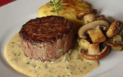 Rundertournedos, gebakken eekhoorntjesbrood, aardappelpannekoek (rösti-stijl) en romige kruidensaus.