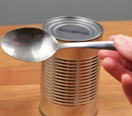 Schuif vervolgens de lepel heen en weer langs de rand, waarbij u ondertussen het blikje opent.